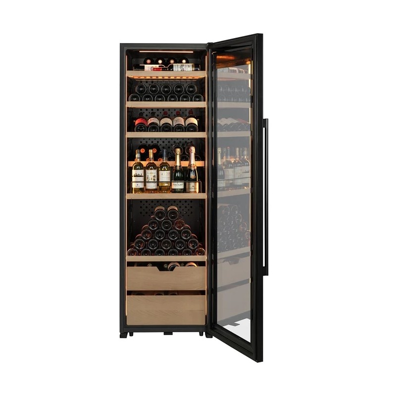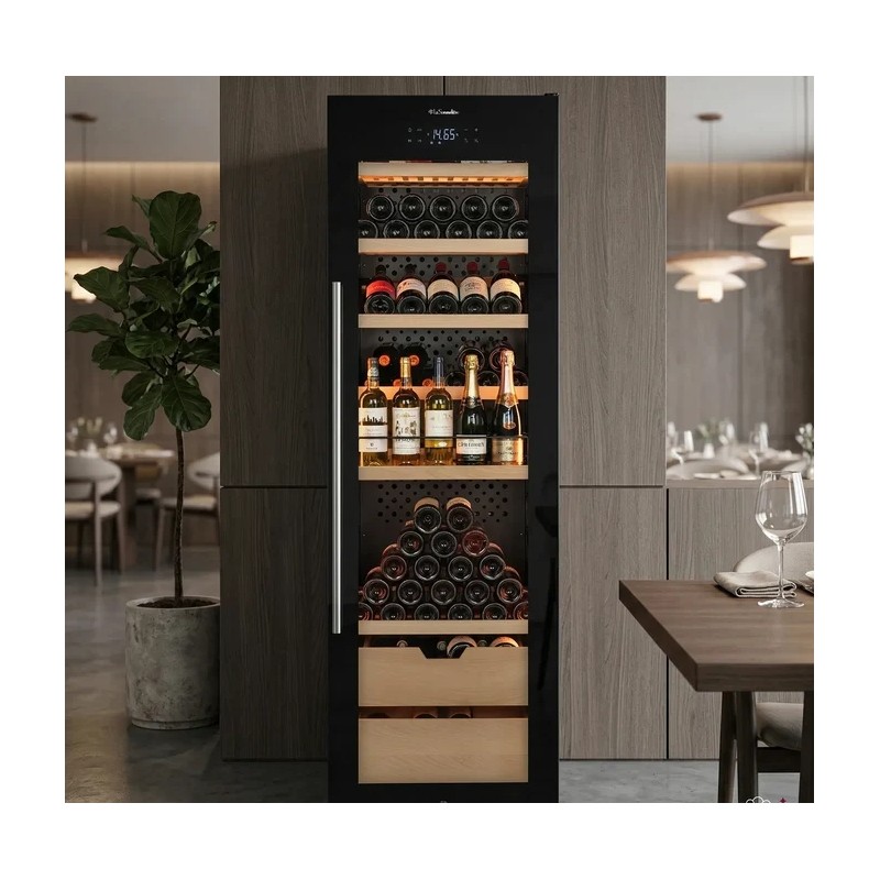 La vinoteca La Sommelière VIP177 EDITION combina un disseny sobri i contemporani amb una cuidada posada en escena del vi. La seva porta de vidre amb tractament Low-E anti-UV protegeix la col·lecció davant de la llum, mentre permet visualitzar cada ampolla amb una il·luminació LED regulable en intensitat i color (blanc càlid, fred i ambre).