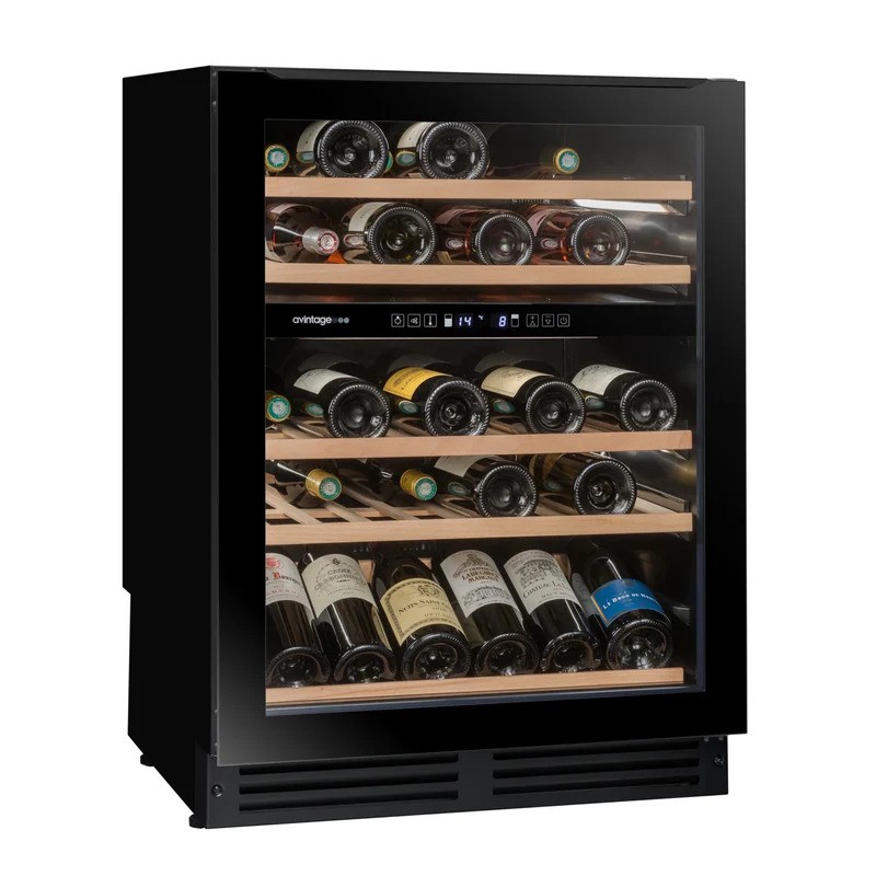 La Vinoteca negra Avintage AVU51D82 es un modelo 100 % integrable bajo encimera con medidas similares a lavadora que ofrece la combinación perfecta entre elegancia, capacidad y tecnología. Con espacio para 44 botellas, esta vinoteca de instalación integrable o libre se adapta fácilmente a cualquier cocina o espacio gourmet. Su diseño en negro con puerta acristalada anti-UV de triple vidrio garantiza la mejor protección frente a la luz y un estilo moderno y sofisticado.